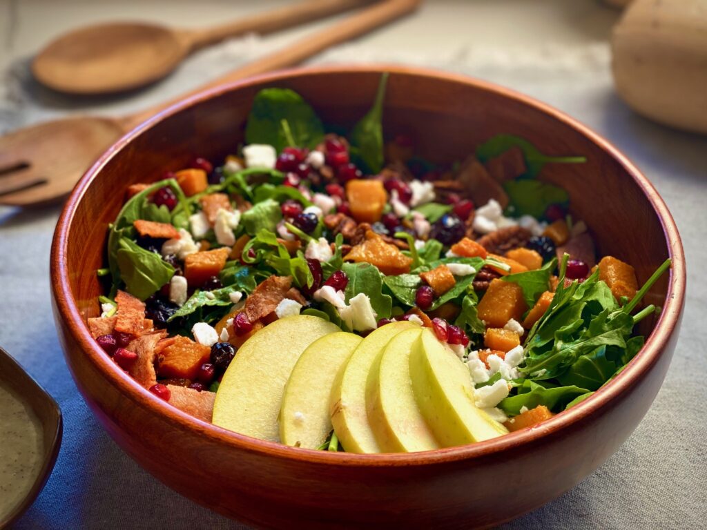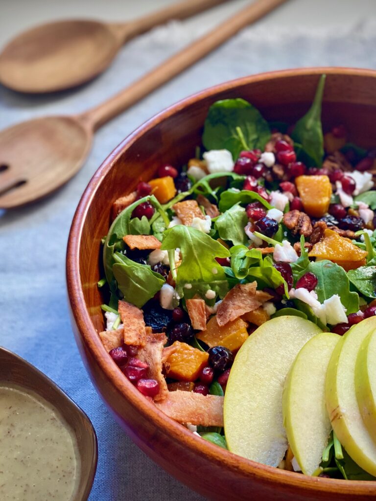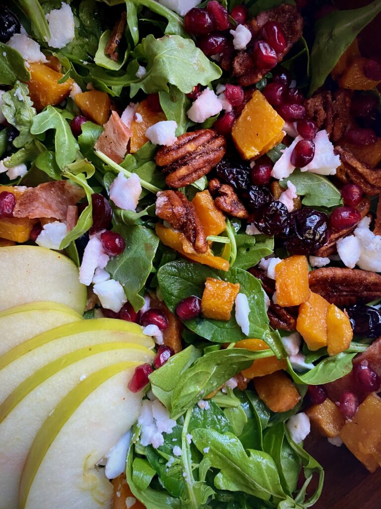 It’s got everything: roasted butternut squash for sweetness, candied pecans for crunch, tart Granny Smith apples for brightness, and rich vegan feta for that salty umami bite. The base of baby spinach and peppery arugula sets the stage, while dried cranberries and optional pomegranate seeds bring little bursts of color and flavor.
