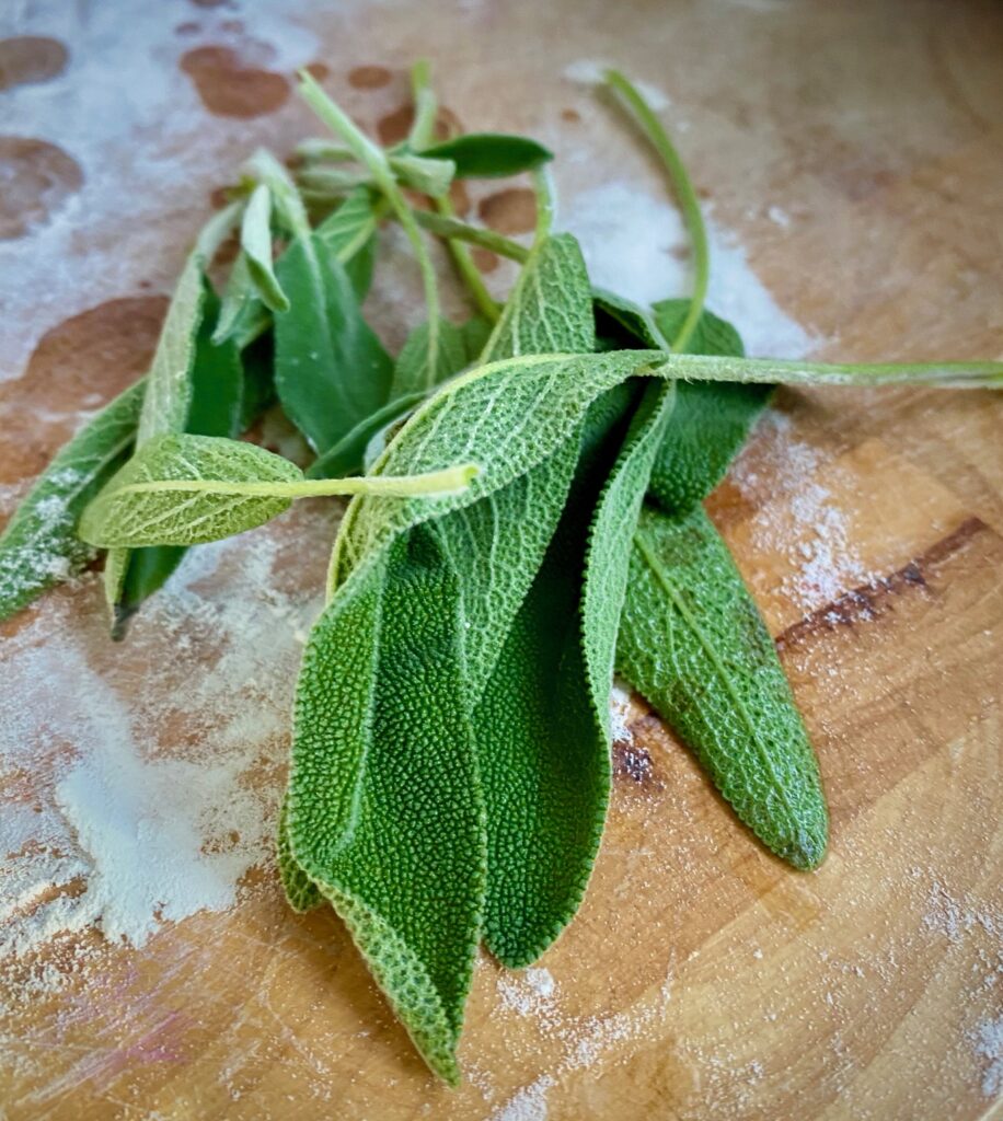 Drizzle lightly with olive oil, season with salt and pepper, and scatter sage leaves on top.