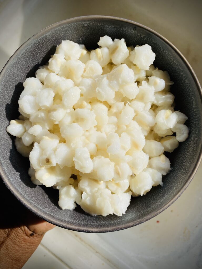 If not already roasted, roast poblano and Serrano peppers along with tomatillos until skins char and blister. Peel, deseed, and set aside. This smoky flavor is the soul of posole verde.