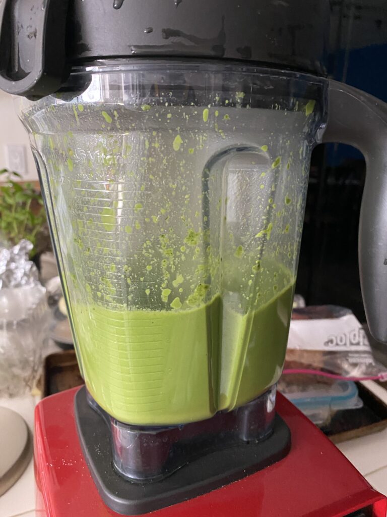 Pour the blended green sauce into the pot with sautéed veggies. Add remaining stock and vegan chicken-style seasoning. Simmer gently to let the flavors meld.