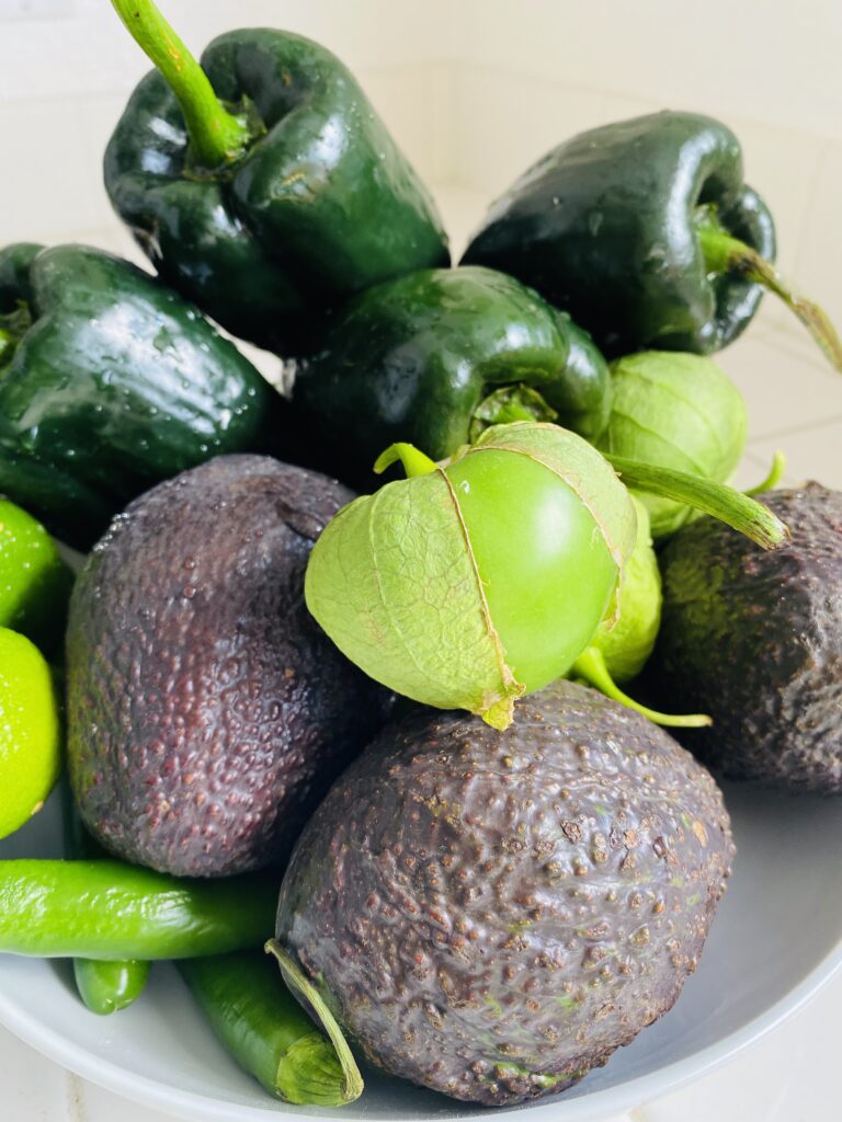 Blend roasted peppers, tomatillos, toasted pepitas, cilantro, and a splash of vegetable stock until smooth. This creates a nutty, zesty, and velvety green sauce.