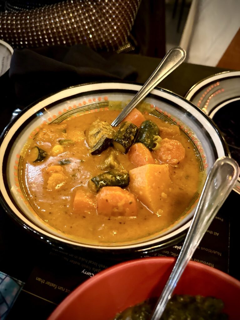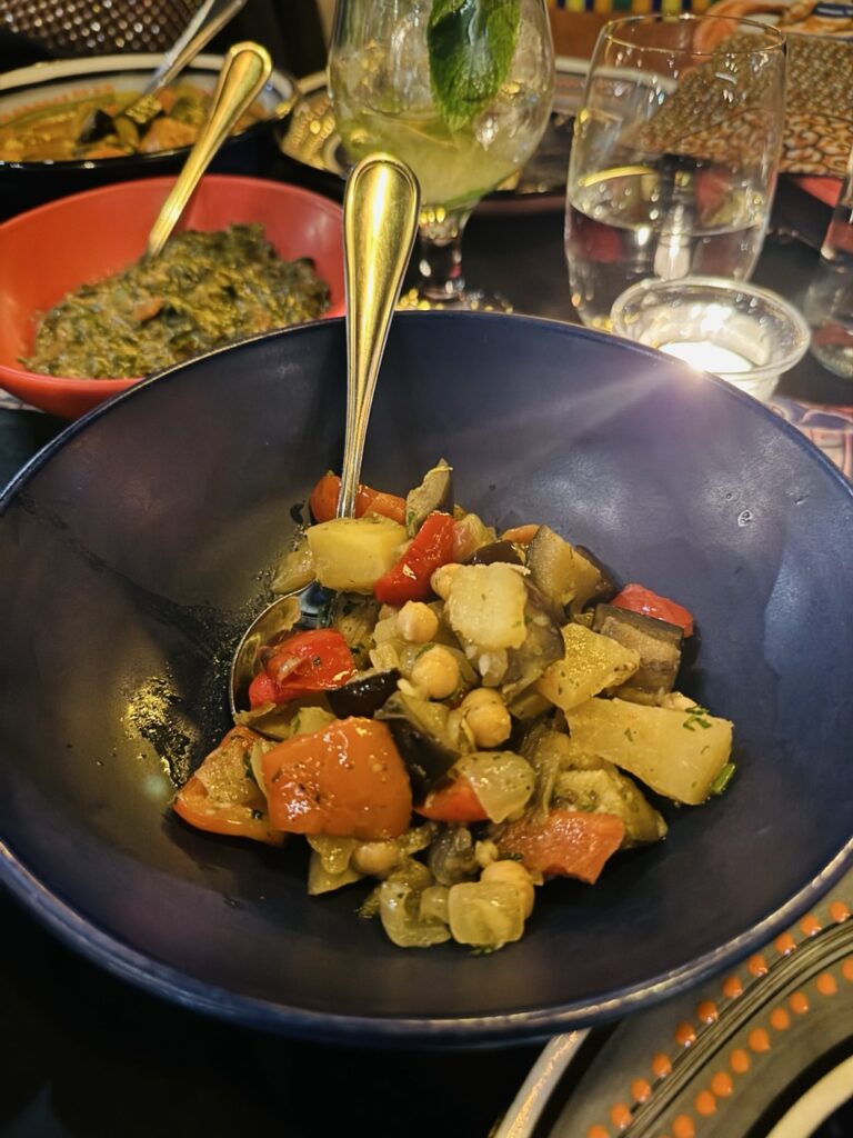 Next, dinner arrived, course after course being served family-style, with servers explaining each dish and its country of origin. My plant-based tasting journey included delicately spiced Ethiopian-style lentils, smoky North African vegetable tagines, West African peanut-stew-inspired vegetables, fragrant Moroccan couscous studded with roasted vegetables, and a bright tomato soup that cut through the richer flavors beautifully.