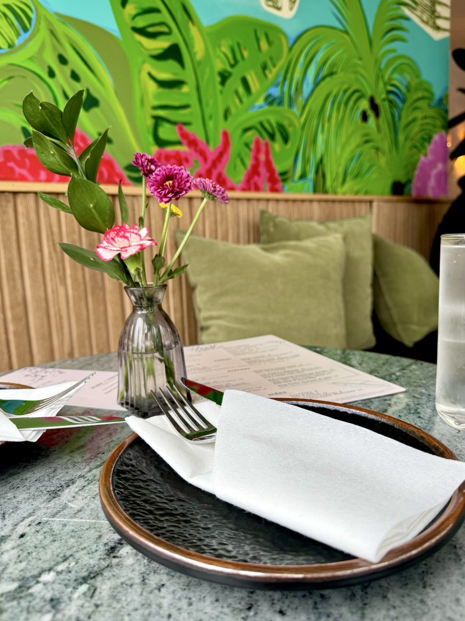 Once I got off the train, it was just a few blocks away and easy to find. From the moment I walked in, I fell in love. The space is modest in size, but the decor is stunning. A vibrant mural bursting with Caribbean-inspired florals instantly sets the tone.