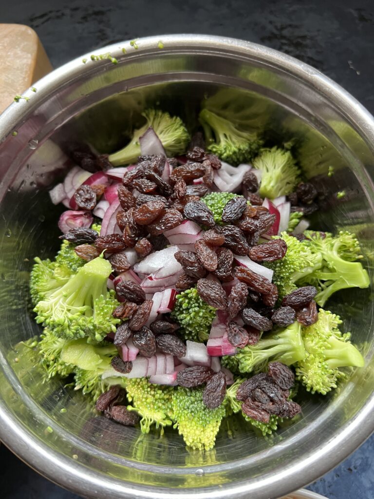 ·      In a large mixing bowl, combine the chopped broccoli, raisins, peanuts, and red onion.